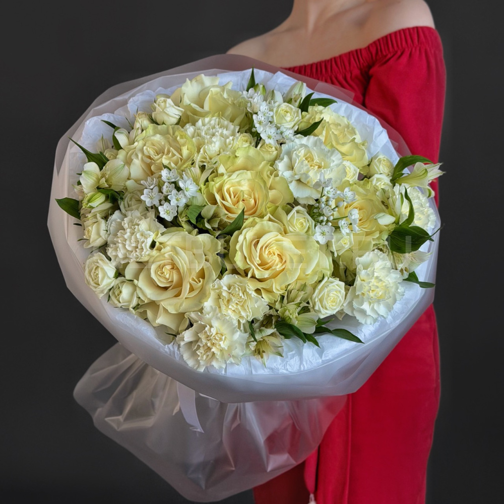 Букет из микса белых роз с аллиумом и альстромерий