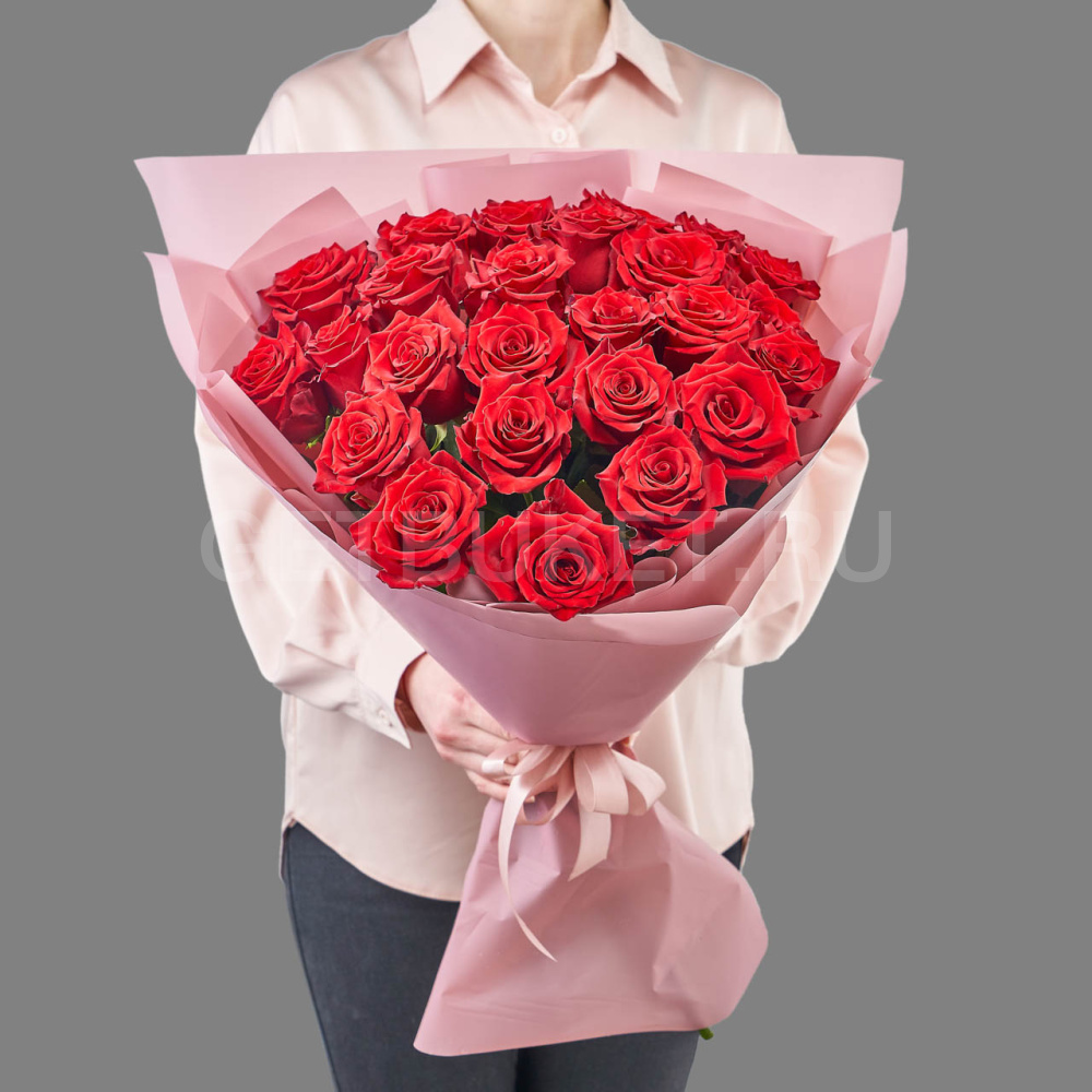 Букет из 25 красных роз в упаковке