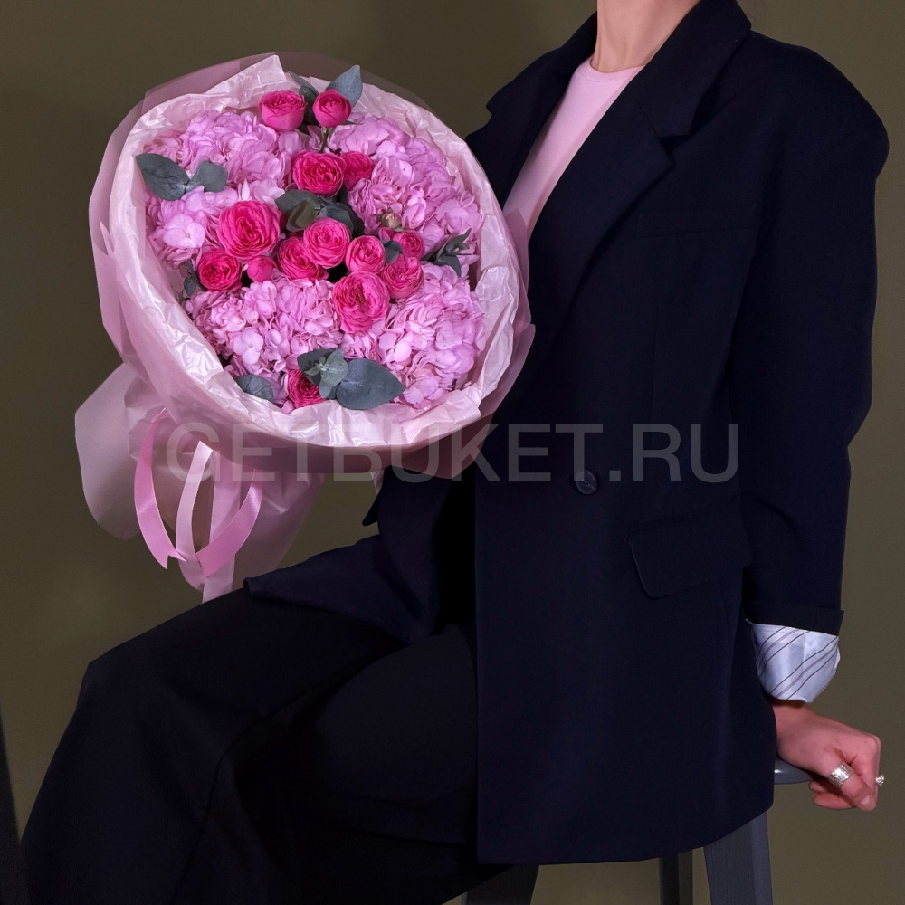 Букет из роз, гвоздик и розовой гортензии с эустомой20 850 ₽Букет из роз, гвоздик и розовой гортензии с эустомой 20 850 ₽ -