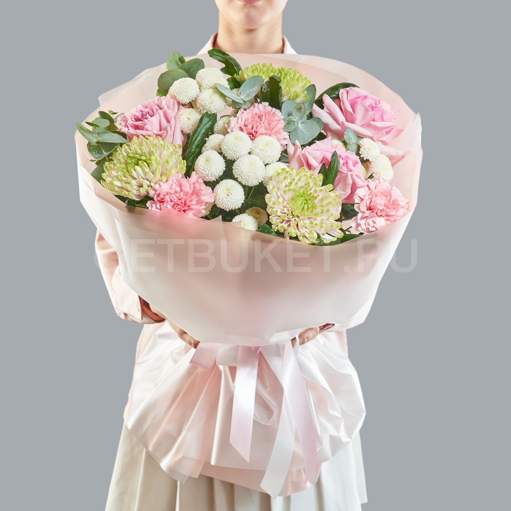 Букет из гвоздик, роз и хризантем с эвкалиптом