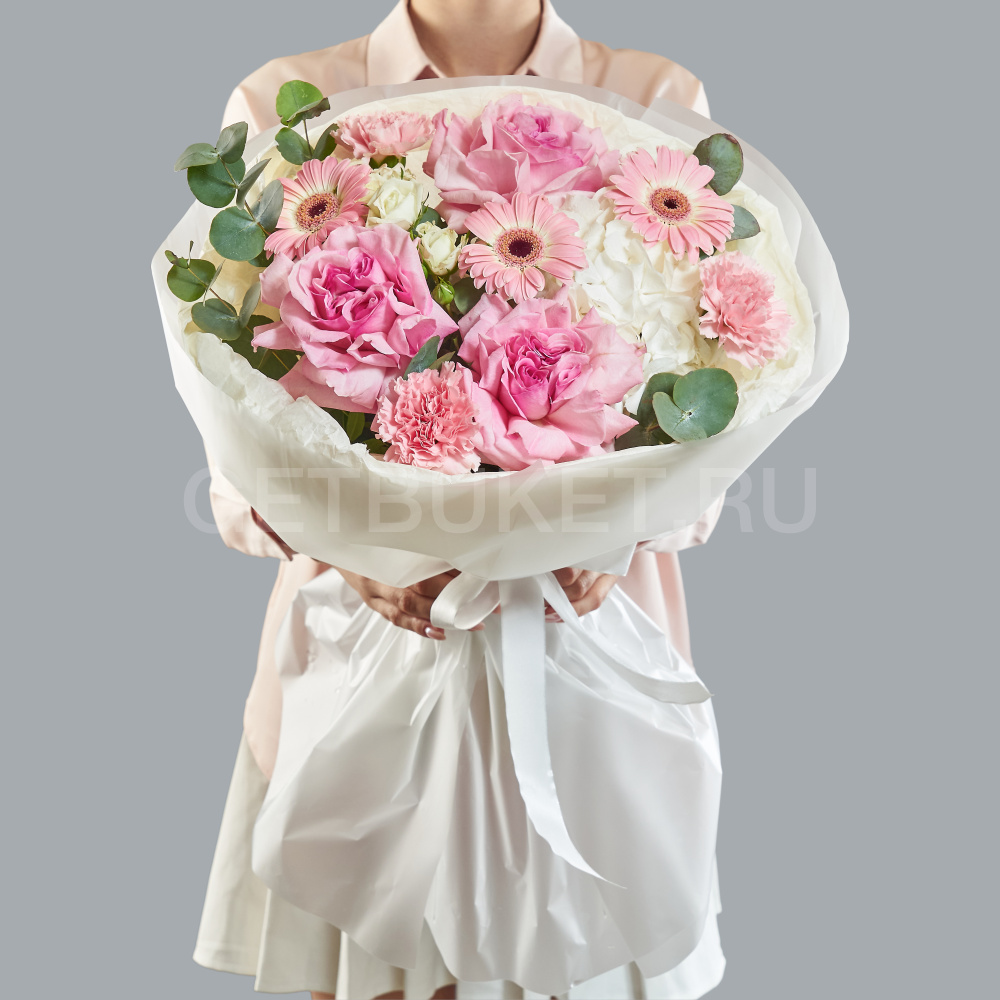 Букет из роз, гвоздик и розовой гортензии с эустомой20 850 ₽Букет из роз, гвоздик и розовой гортензии с эустомой 20 850 ₽ -