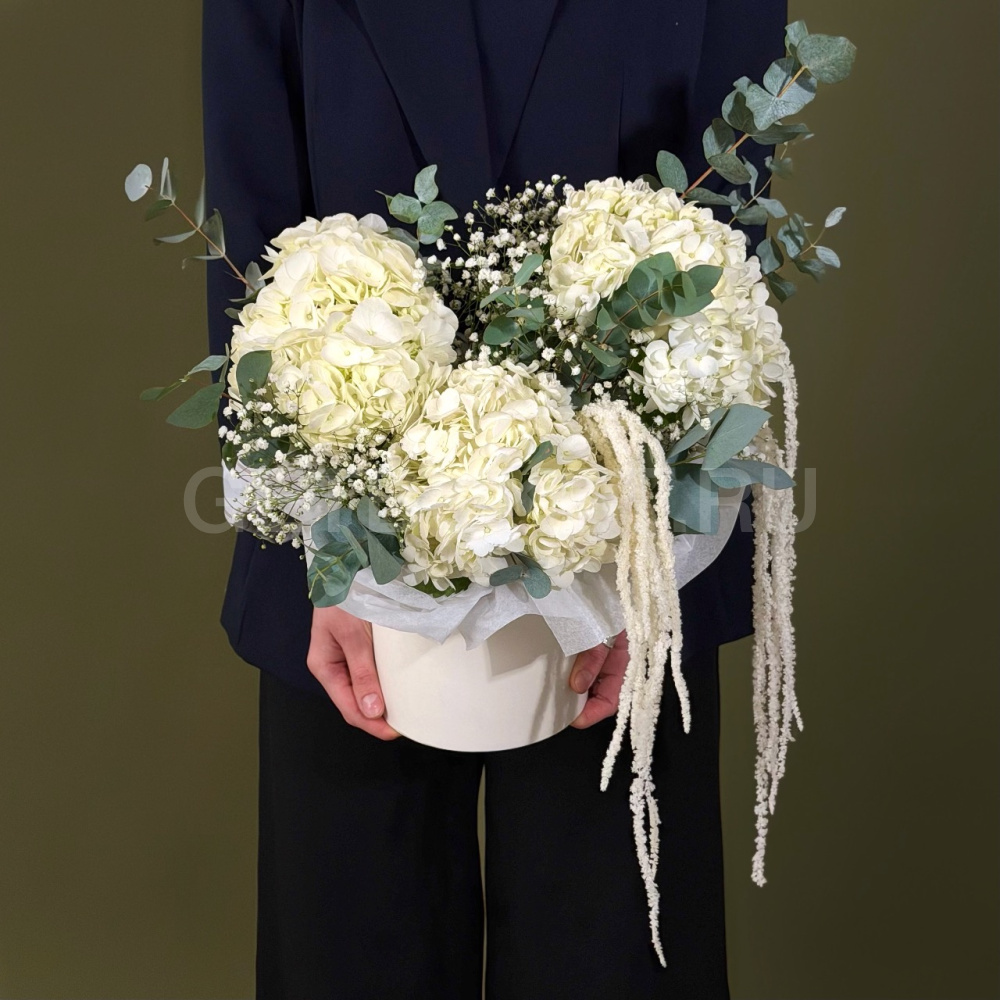 Цветочная композиция из гортензий с гипсофилой в шляпной коробке