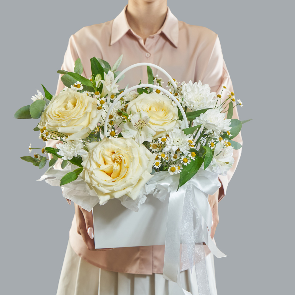Цветочная композиция с розами, хризантемой и танацетумом в сумочке