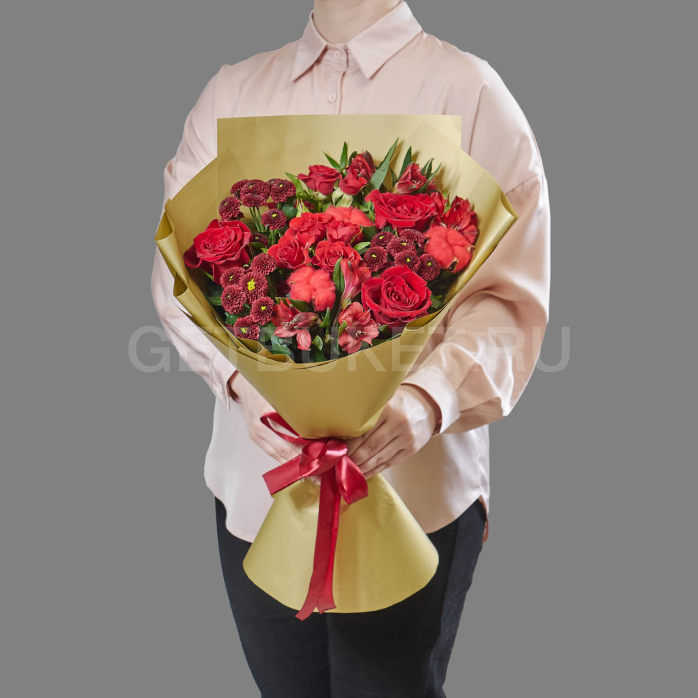 Букет из хризантем, красных роз и маттиолы11 660 ₽Букет из хризантем, красных роз и маттиолы 11 660 ₽ -