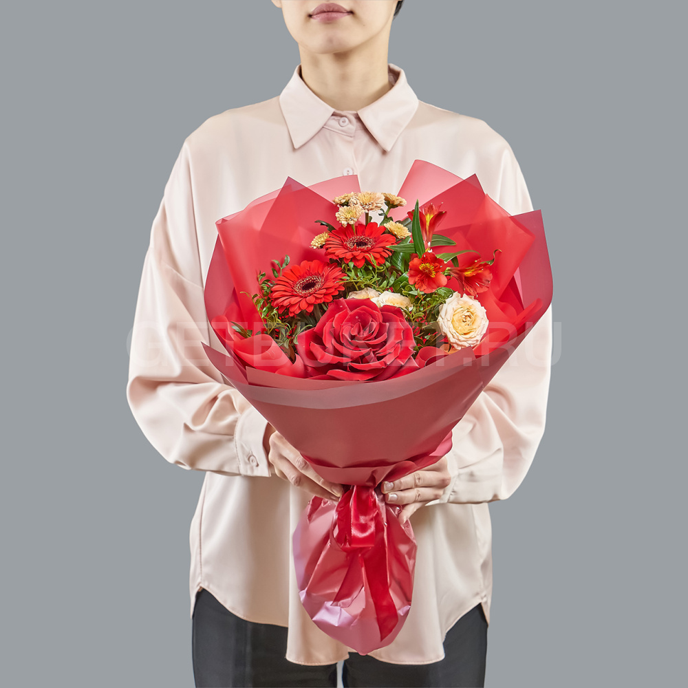Алый букет роз, гербер и альстромерии