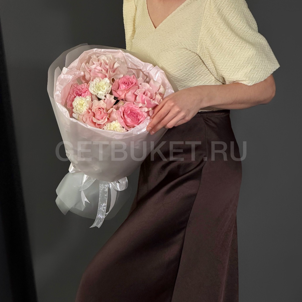 Букет розовых роз с гвоздиками