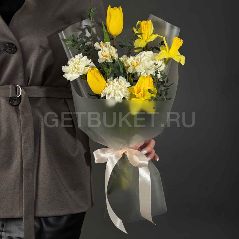 Букет из нарциссов, тюльпанов и форзиции6 450 ₽Букет из нарциссов, тюльпанов и форзиции 6 450 ₽ -